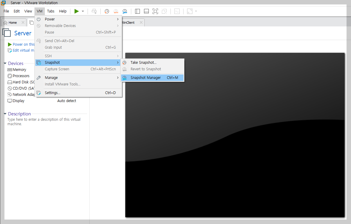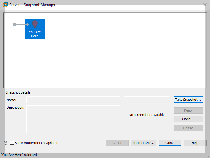 VMware 메뉴에서 'VM'을 선택하여 'Snapshot'을 선택하고 'Snapshot Manage'를 누르면 다음과 같은 장면을 맞는다. 'Take Snapshot'을 통해 현재 상태를 찍어서 보관한다. 만약 문제가 있으면 이 지점으로 복원이 된다.