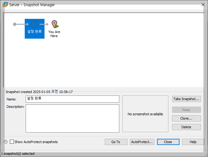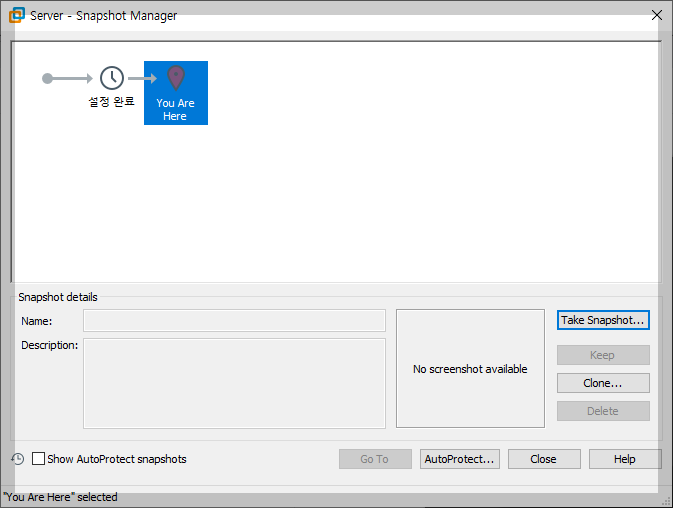 '설정 완료'라는 이름으로 등록한 스냅숏을 이용할 때는 '설정 완료' 스냅숏 이미지를 사용하여 복원할 수 있다. 스냅숏 관리창은 VMware 프로그램이 관리하기 때문에 게스트에 문제가 생겨도 이상 없이 복원할 수 있다.