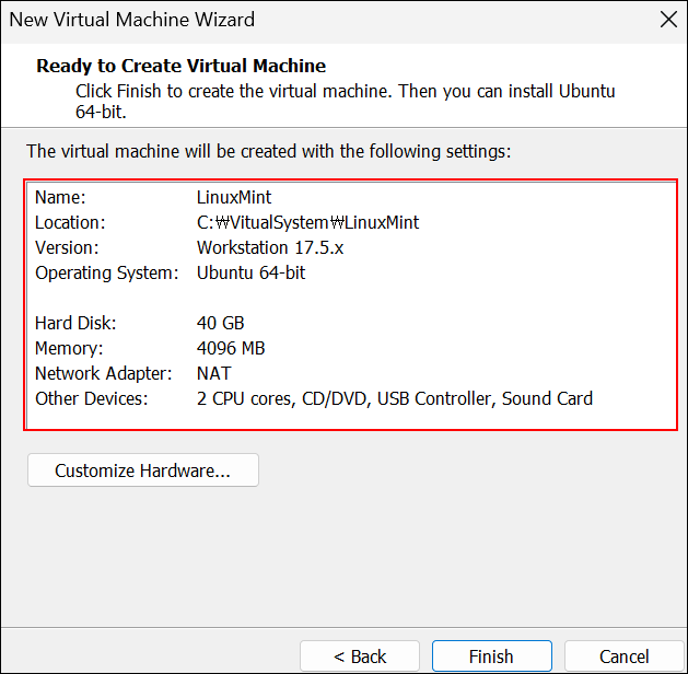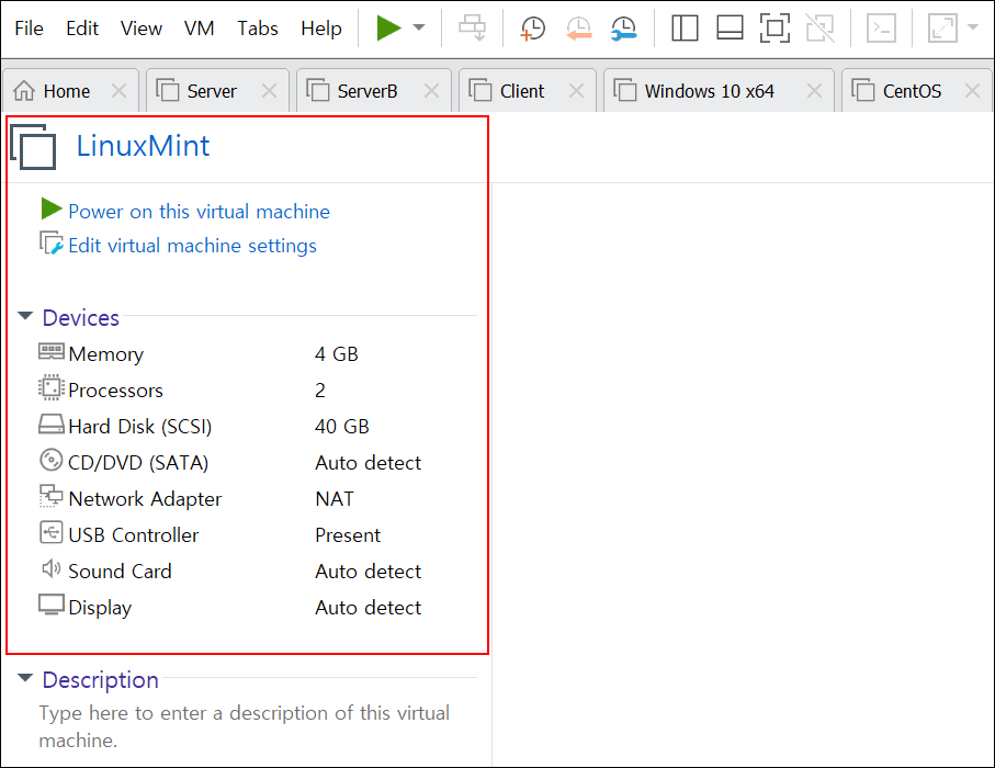 'Finish' 버튼을 클릭하면 만들어진 가상 컴퓨터의 하드웨어가 등장합니다. 이제 이 껍데기가 완성된 컴퓨터에 운영체제를 설치합니다. 아래 사양이면 리눅스민트를 운영하는데 충분한 사양입니다. 메모리 4기가에 하드디스크 40기가, 그리고 CD, USB, Sound Card 등이 갖춰진 컴퓨터가 하나 생긴 것입니다.