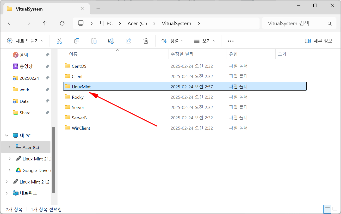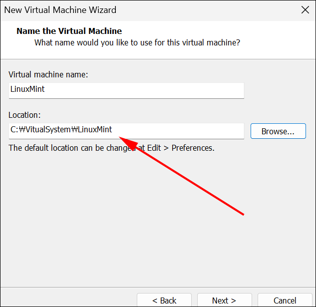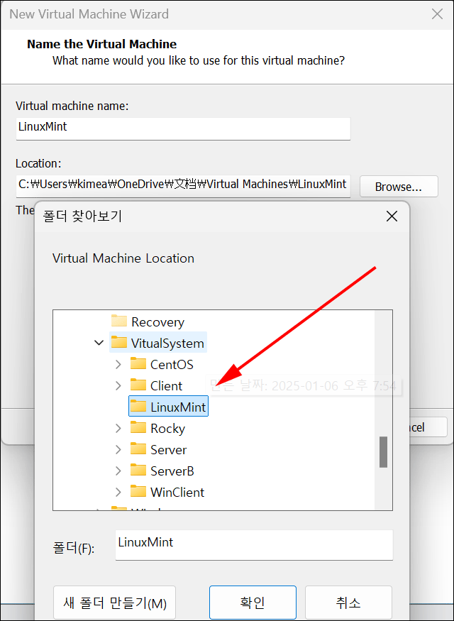 이 부분은 중요합니다. 물론 설정된 위치에 별 생각없이 진행해도 설치는 무난하지만 어디에 가상머신이 설치되며 어떤 파일 구조를 갖는가를 아는 것도 중요합니다. 우리는 호스트 컴퓨터의 'VirtualSystem'의 'LinuxMint'에 설치하고 있습니다. 이 경로를 정확하게 지정하고 이름도 바꿔줍니다. 목록에 'LinuxMint'가 없어 같은 계열의 'Ubuntu'를 선택했지만 실제 패키지는 리눅스민트이기 때문에 'LinuxMint'로 변경했습니다. 물론 자신이 잘 알아볼 수 있는 이름이면 됩니다.