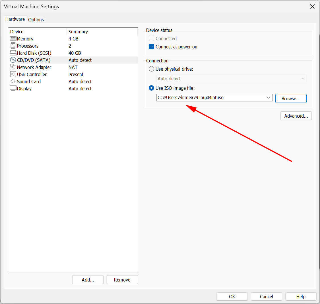 완성된 가상의 하드웨어에 운영체제를 설치합니다. 설치는 CD 이미지를 이용할 것입니다. 다음과 같이 다운로드한 이미지 파일을 맞춰주고 전원을 On하면 시스템이 부팅되면서 가상 하드웨어에 설치를 진행합니다.