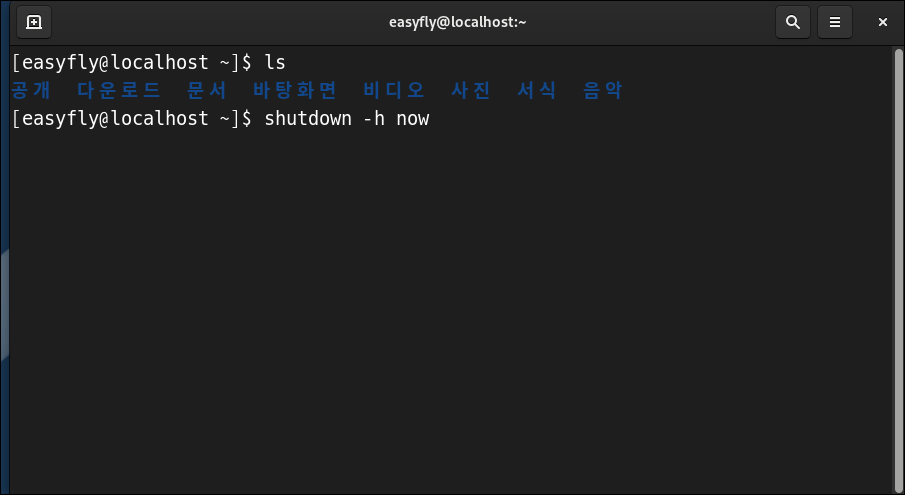 | shutdown -h now | 시스템을 즉시 종료 (-h: halt) |
