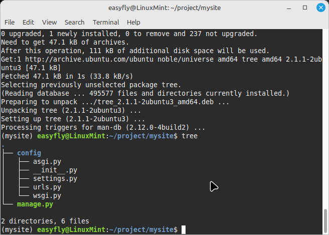 프로젝트는 'project/mysite'를 만들어 이곳에서 진행하겠습니다. 'project/mysite'에서 'pip install django'로 최신 버전의 장고를 설치합니다. 설치 후에 장고 프로젝트를 생성합니다. 장고 프로젝트 생성은 'django-admin startproject config .'입니다. 생성된 파일의 구성은 아래와 같습니다.