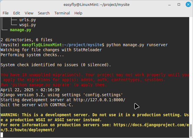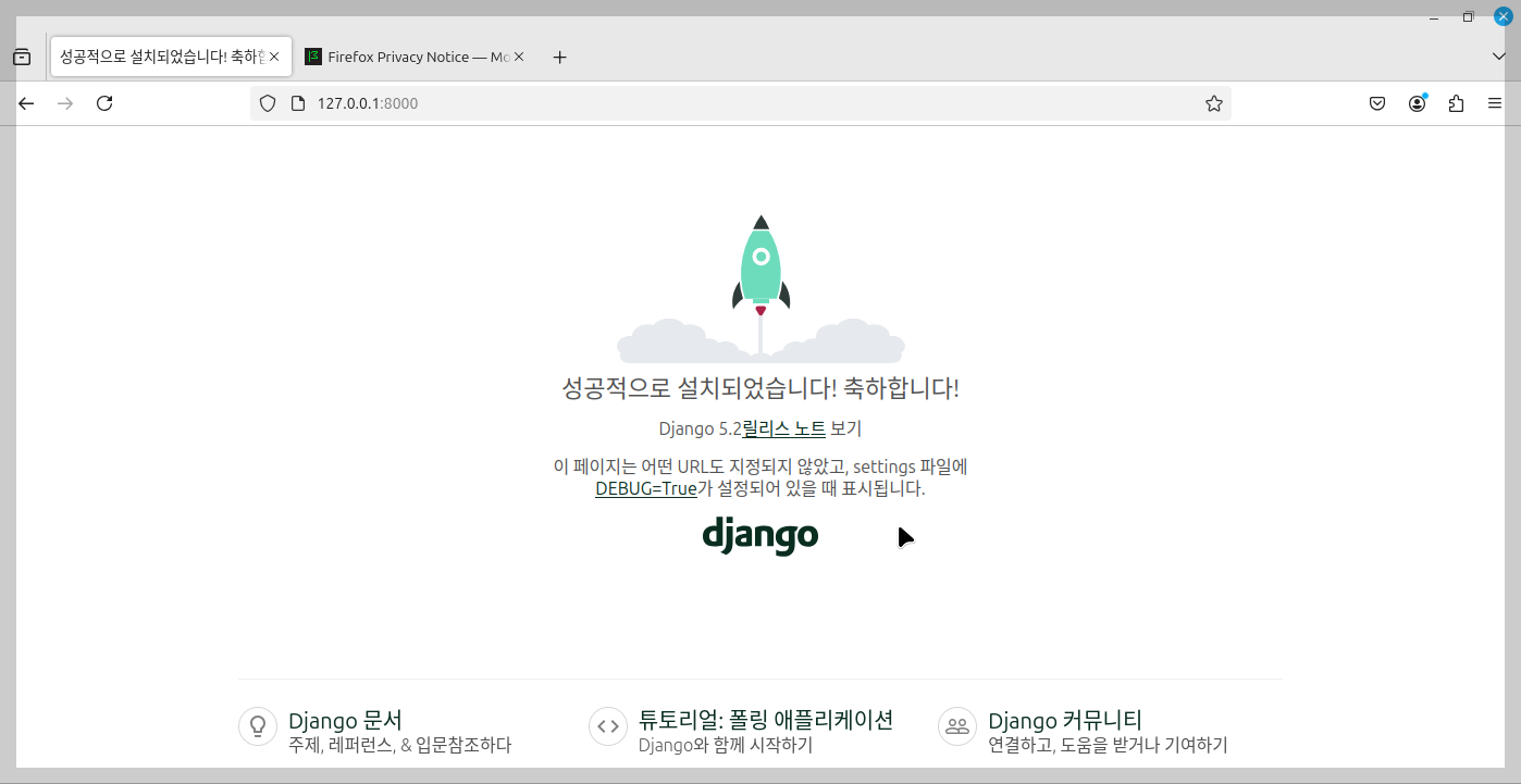 장고 웹 프레임워크의 기본이 끝났습니다. 뼈대가 형성됐습니다. 이제 앱 생성하고 기타 여러가지 설정을 통해 근육을 추가하면 웹 서비스가 가능하게 됩니다.