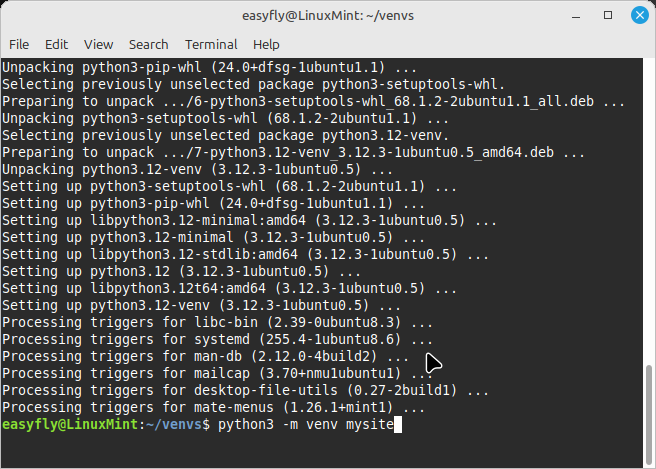가상환경을 관리할 폴더를 'venvs'를 만들어 그곳에서 'python3 -m venv mysite'라는 명령으로 가상환경 'mysite'를 만듭니다. 가상환경으로 진입하기 위해서는 'source mysite/bin/activate'를 실행합니다. 가상환경을 끝내는 명령은 'deactivate'입니다.