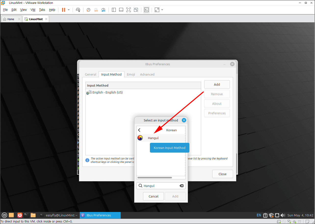 리눅스민트는 영문 상태로 설치하고 한글 입력기를 설정하는 것이 더 잘 됩니다. 영문 상태로 시스템을 설치한 후에는 기본적으로 수퍼유저 'root'의 암호를 설정합니다. 수퍼유저 암호 설정은 문제사태가 발생하면 해결할 수 있는 무한 권력의 키입니다. 이어서 한글입력기 설정을 합니다. 한글 입력은 'ibus-hangul'이 잘 듣습니다. 'sudo apt install ibus ibus-hangul'로 동시에 설치하고 'ibus-setup'으로 환경을 설정합니다.