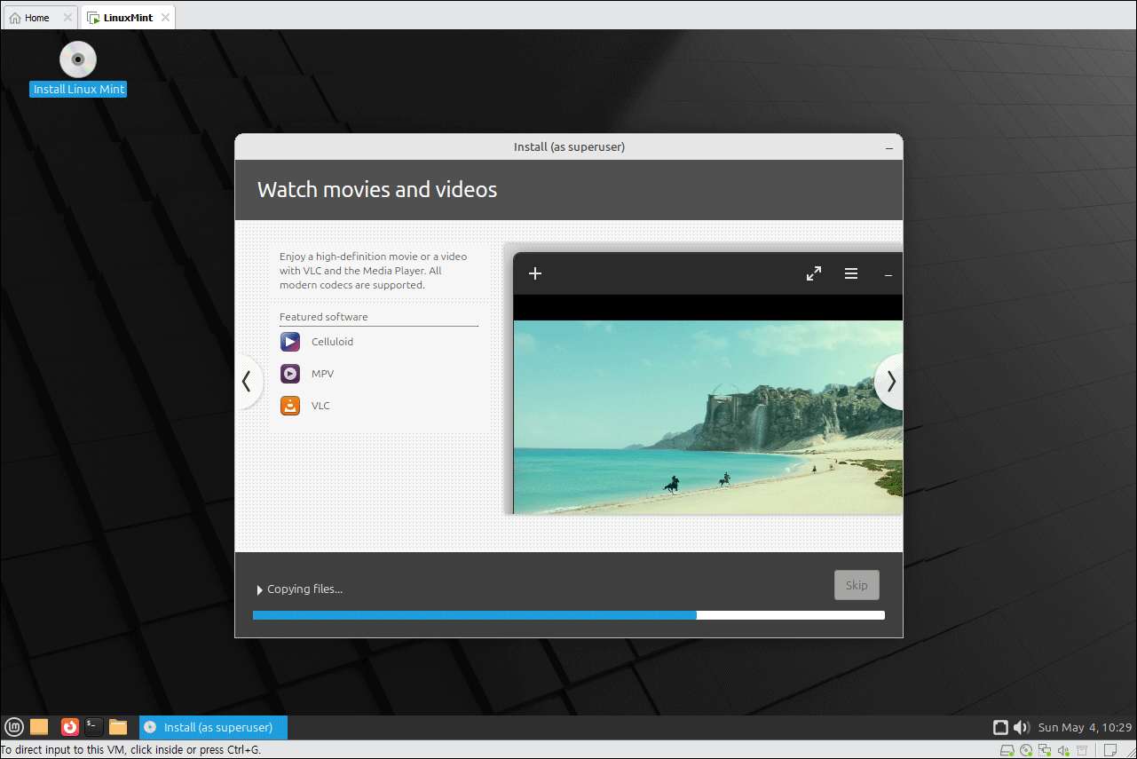 가상환경에서 리눅스민트를 설치하는 경우 첫 화면의 이해가 필요합니다. 리눅스민트 설치 과정에서 초기 화면에서 리눅스를 경험할 수 있습니다. PC에 설치된 것은 아니지만 메모리에 리눅스가 올려진 상태에서 리눅스 명령들을 사용할 수 있고 시스템 하드웨어를 접근할 수도 있습니다. 화면 좌상단 'Install LinuxMint'를 실행해야 설치가 진행됩니다.