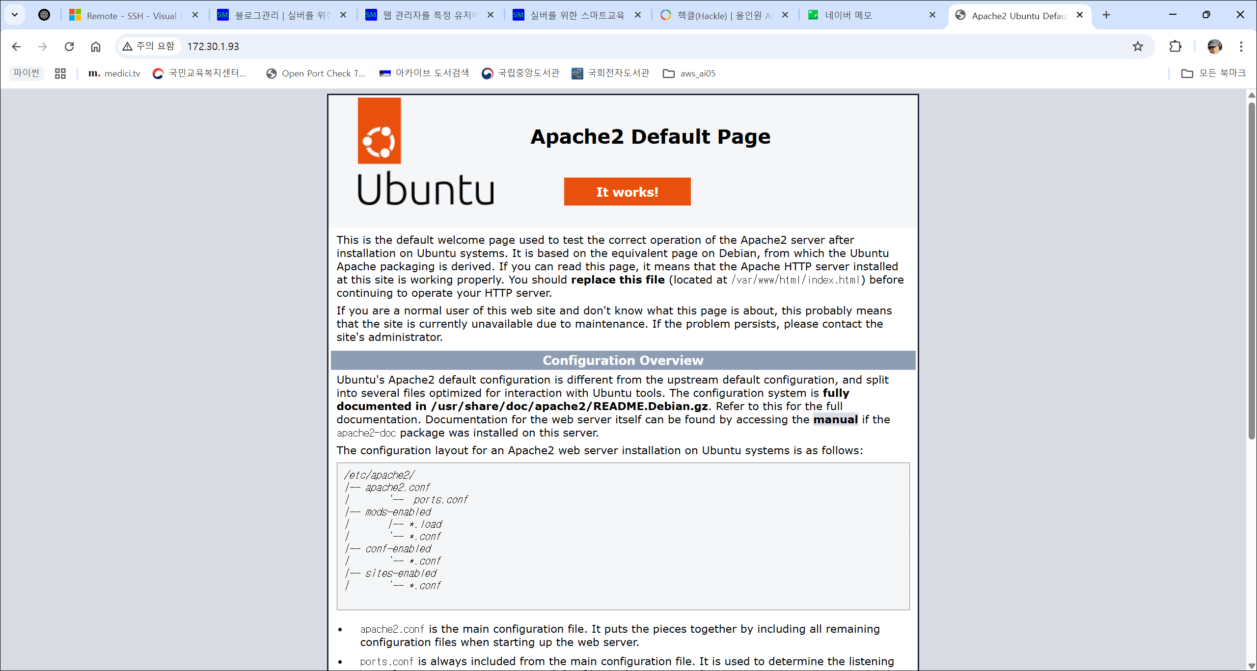 → “Apache2 Ubuntu Default Page” 화면이 뜨면 정상 설치 완료.