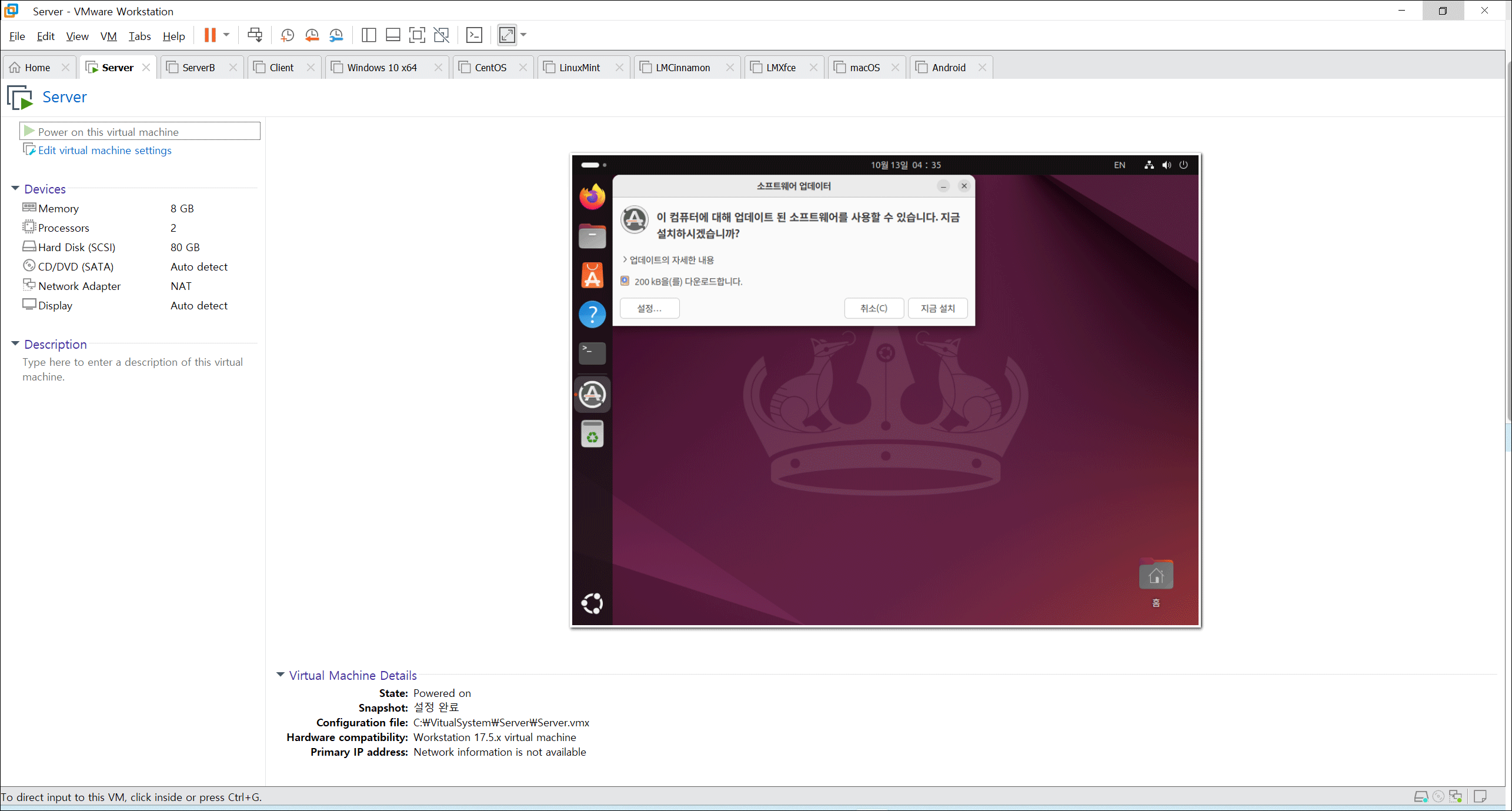 - 가상 머신 종료: 현재 실행 중인 "Server" 가상 머신의 전원을 완전히 끕니다. (Shutdown)