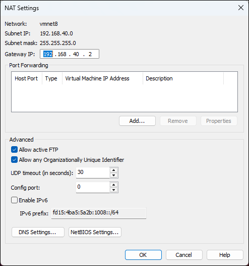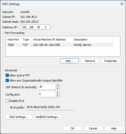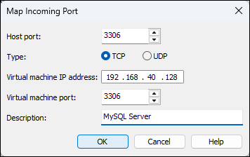 Host port: 3306 Type: TCP Virtual Machine IP address: 192.168.40.128 Virtual Machine port: 3306