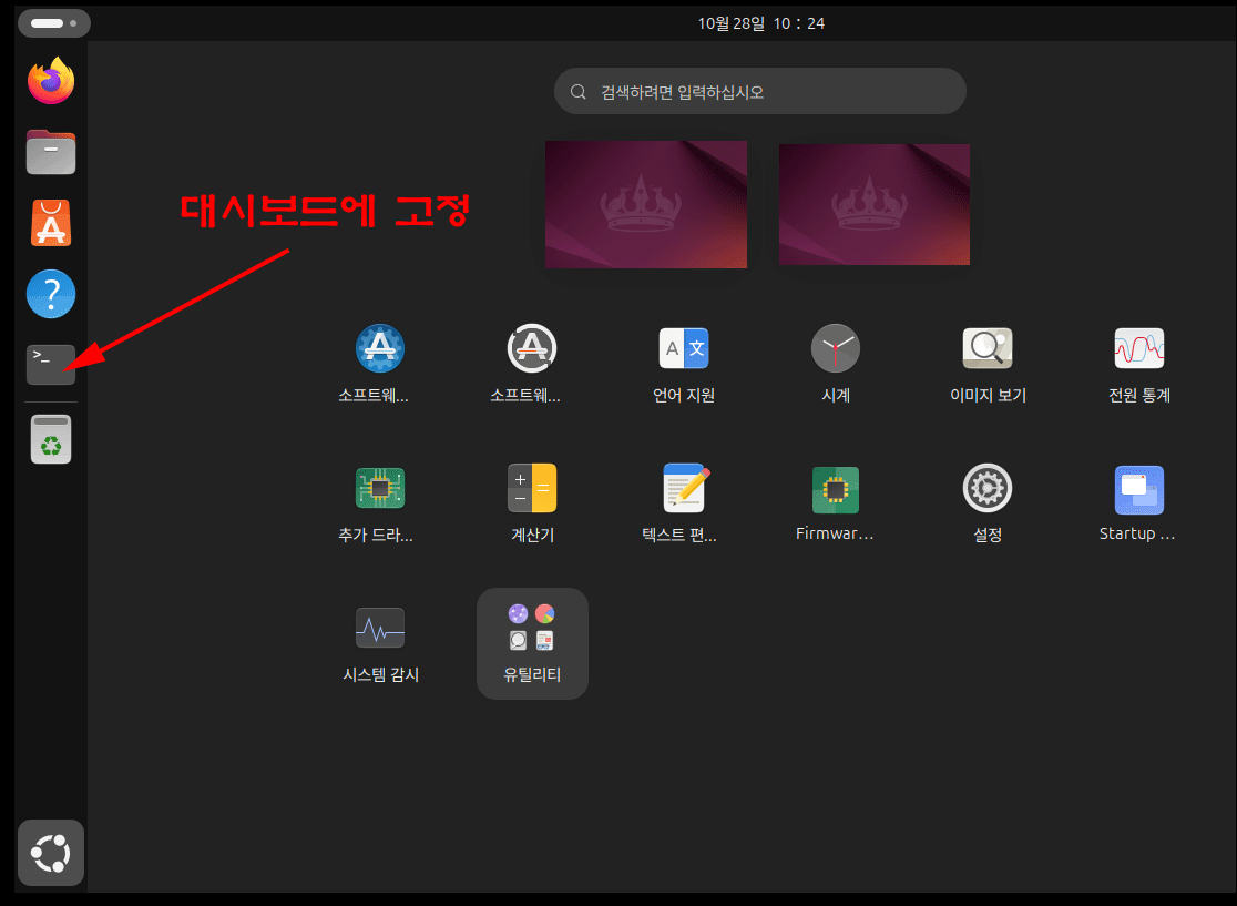 대시보드(왼쪽 런처 바)에 고정해 두면 훨씬 편리합니다.