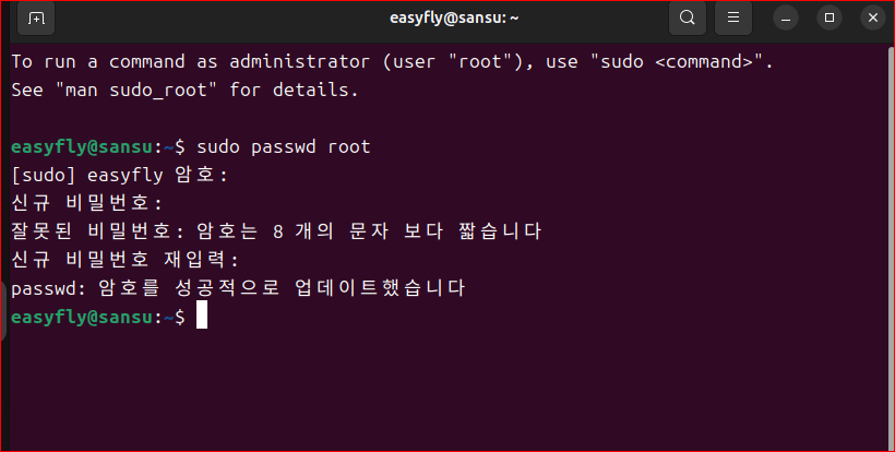 이제부터는 su 명령으로 루트 계정으로 전환할 수 있습니다.
