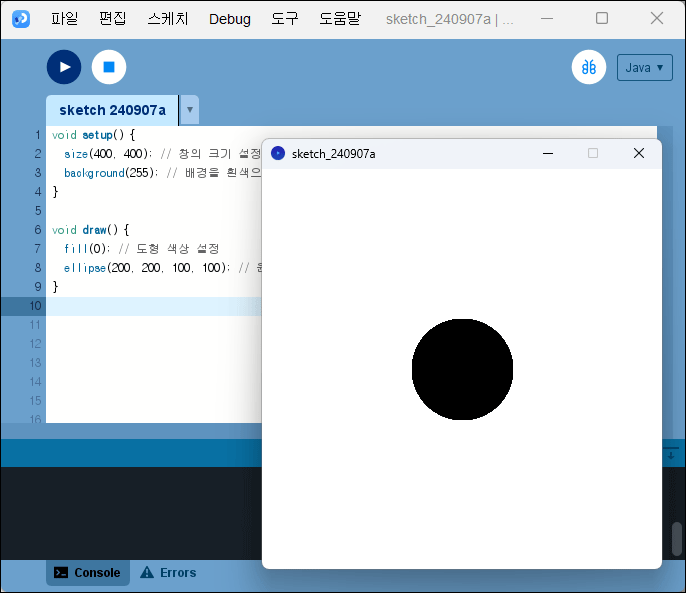 | [프로세싱] 콘솔(Console)과 스케치 창(Sketch Window)의 차이 (16) | 2024.09.14 |