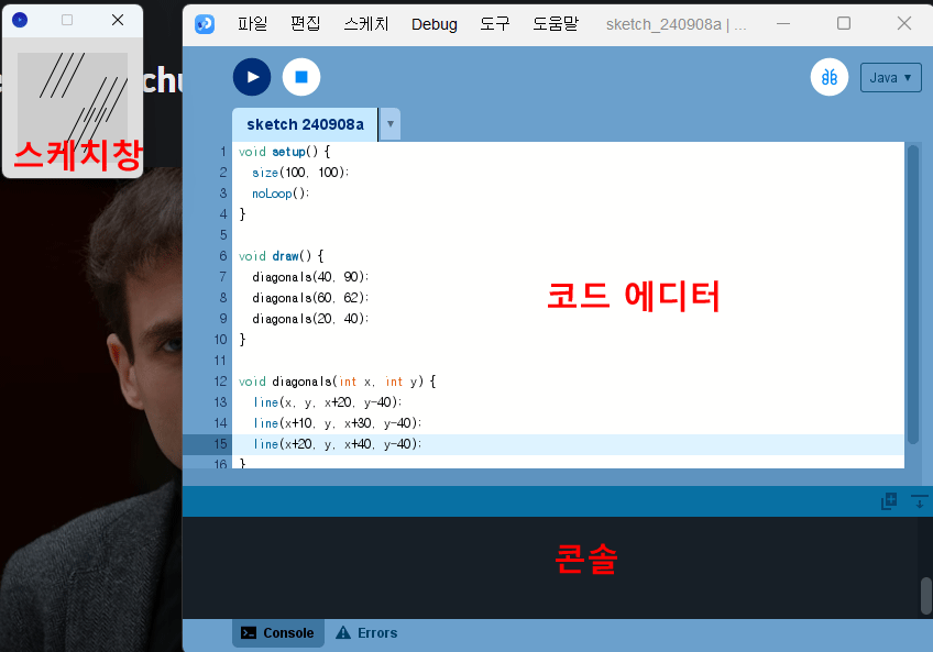 | [프로세싱] 콘솔(Console)과 스케치 창(Sketch Window)의 차이 (16) | 2024.09.14 |