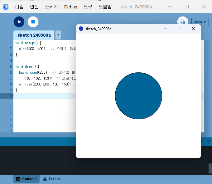 이 코드를 실행하면, 스케치 창에 400x400 크기의 창이 나타나고 그 안에 파란색 동그라미가 그려집니다.