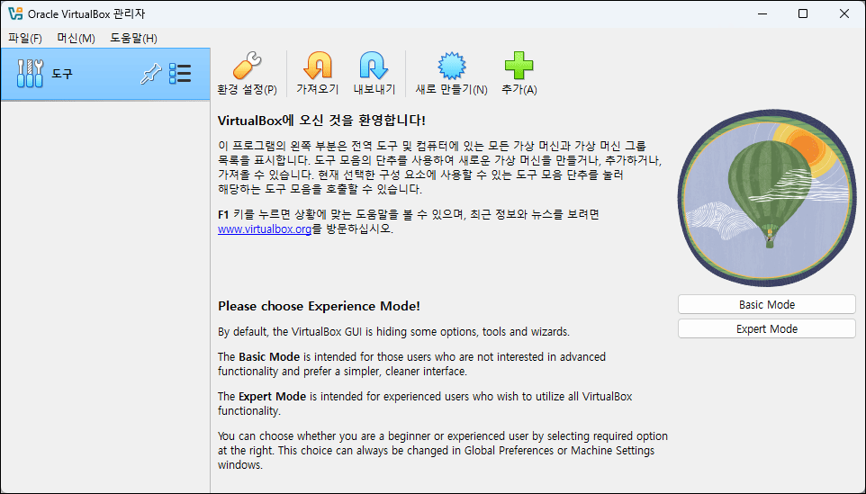 - VirtualBox 설치가 완료되면 프로그램을 실행합니다.