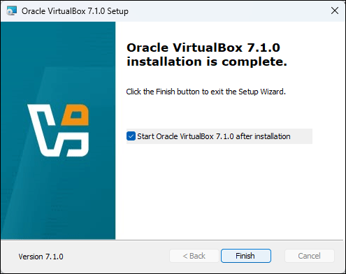 - 설치가 완료되면 "Finish" 버튼을 클릭합니다. 이때 "Start Oracle VM VirtualBox after installation" 옵션을 선택하여 설치가 완료되면 바로 VirtualBox를 실행할 수 있습니다.