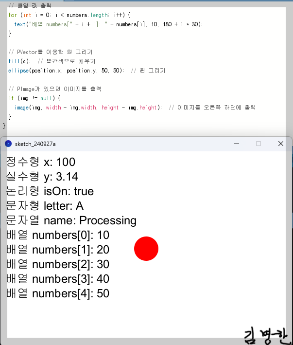 text("배열 numbers[" + i + "]: " + numbers[i], 10, 180 + i * 30);