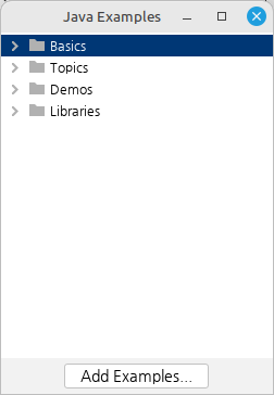 프로세싱 프로그램에는 예제 프로그램이 수록되어 있습니다. 예제 프로그램은 크게 네 개의 범주로 나눠져 있습니다. 'Basics', 'Topics', 'Demos', 'Libraries'가 그것입니다.