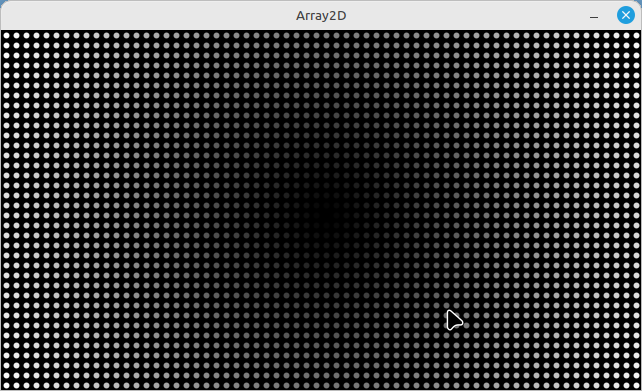 이 코드는 화면 중심에서 멀어질수록 밝기가 낮아지는 점들로 구성된 패턴을 만듭니다. spacer 값을 조절하면 점의 밀도를 변경할 수 있으며, 이를 통해 더 조밀하거나 희박한 시각적 패턴을 생성할 수 있습니다.