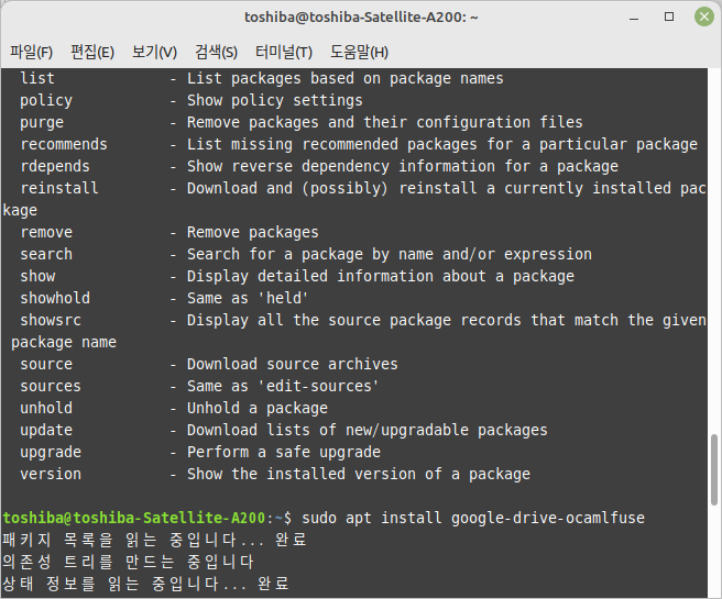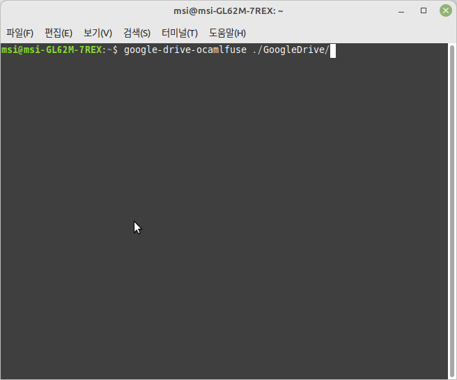 자신의 구글 드라이브를 위에서 만든 디렉터리에 마운트시키는데 일반 마운트 시키는 방법과는 달리 'google-drive-ocamlfuse' 명령어를 이용하여 마운트 시킵니다.