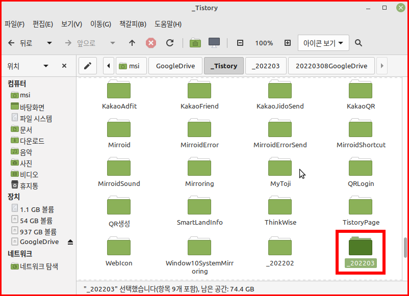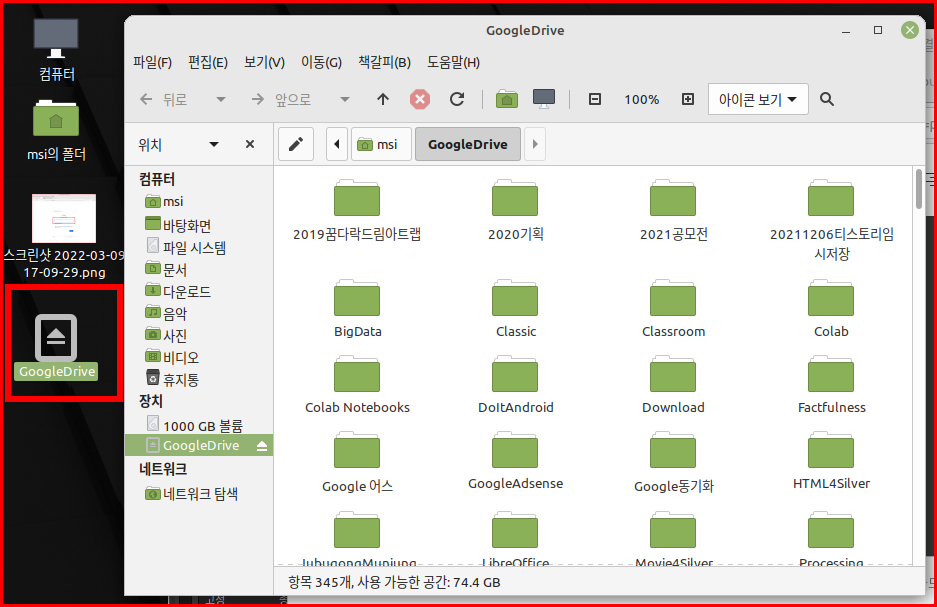 구글 드라이브를 연결하여 자신의 디바이스인 것처럼 사용할 수 있습니다. 리눅스 데스크톱에서 탐색기를 열어 구글 드라이브 내용을 확인하고 이용할 수 있습니다.
