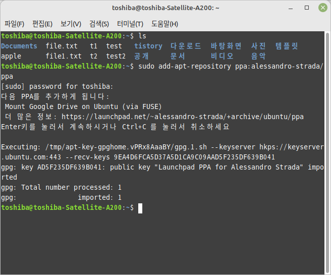 위 세 과정을 거쳐 'google-drive-ocamlfuse' 설치를 성공해야 합니다. 그 뒤에는 구글 드라이브를 연결하는 이 프로그램을 통해 자신의 홈 디렉터리에 마운트 시킵니다. 마운트라는 개념은 다른 디바이스나 쿨라우드 데이터를 자신의 디바이스 아래에 연결하는 것입니다. '마운트'는 올린다는 얘기이니, 올릴 수 있는 폴더를 만들고 거기에 연결을 하는 것입니다. 우선 자신의 홈 디렉터리에 폴더 하나를 만듭니다. 임의의 폴더를 만들어도 되지만 알기 쉽게 'GoogleDrive'라는 폴더를 만들겠습니다. 리눅스에서는 대소문자 구별이 되기 때문에 대문자와 소문자 구별을 잘하면서 사용해야 합니다.