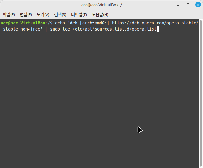 | sudo tee /etc/apt/sources.list.d/opera.list:|(파이프)는 앞 명령어의 출력을 다음 명령어의 입력으로 전달합니다.sudo: 관리자 권한으로 다음 명령어를 실행합니다.tee /etc/apt/sources.list.d/opera.list:tee명령어는 표준 입력을 파일로 출력하는 역할을 합니다. 여기서는/etc/apt/sources.list.d/opera.list파일에 내용을 작성하면서 동시에 터미널에도 출력합니다.- 이 명령은