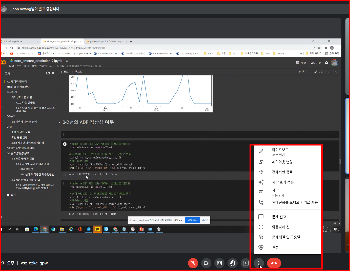 사용하는 방법은 '줌 화상회의 시스템'과 큰 차이가 없습니다. 구글미트 아래의 [점세개] 더보기를 선택하면 메뉴가 올라오면서 여러가지 설정을 변경하거나 서비스를 실행할 수 있습니다.