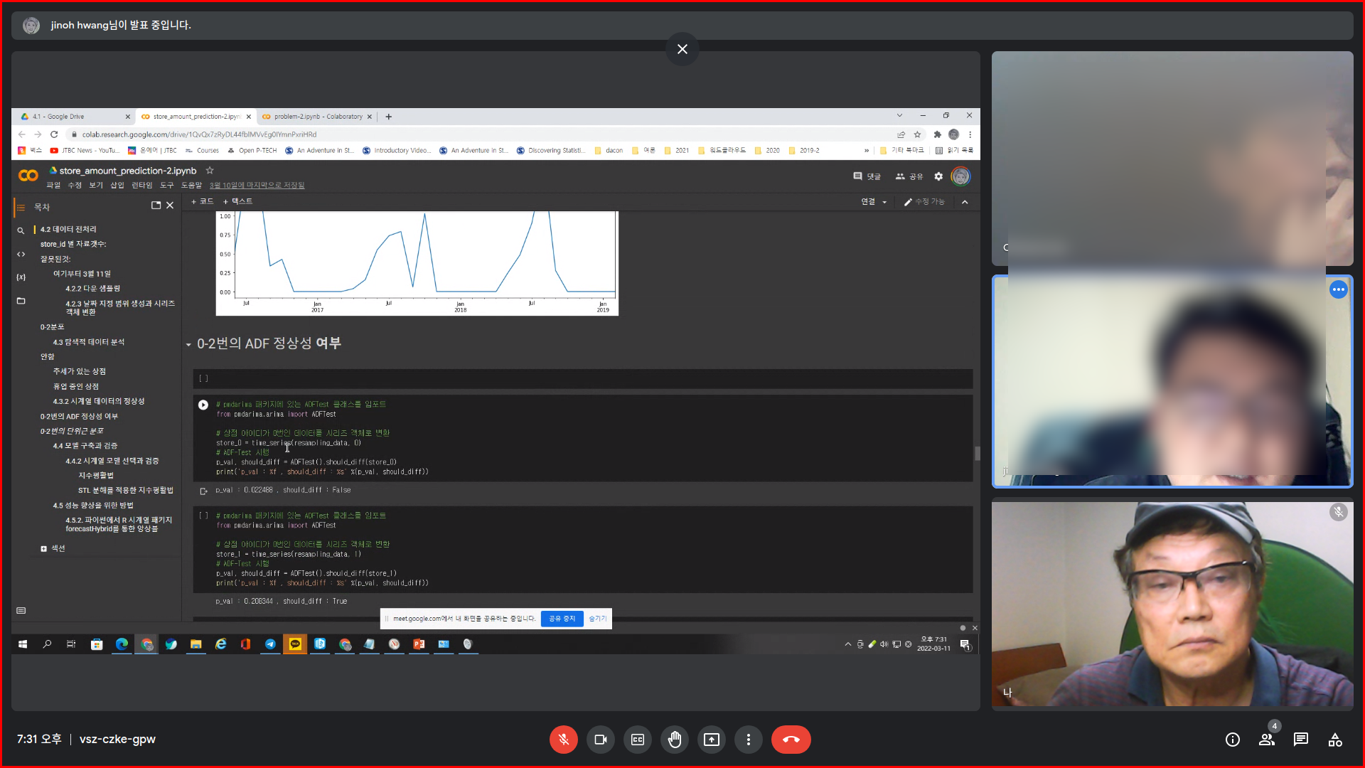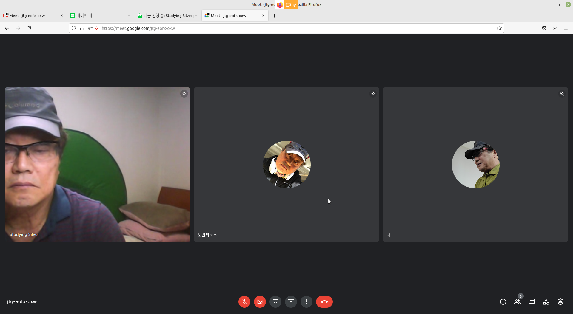 화상회의 시스템 '구글미트'는 같은 화면에서 두 사용자의 참여도 가능하군요. 오른쪽은 구글메일로 시작한 호스트, 왼편은 네이버 내 아이디로 초청해서 들어온 게스트입니다.(기록을 위해 적어 둠)