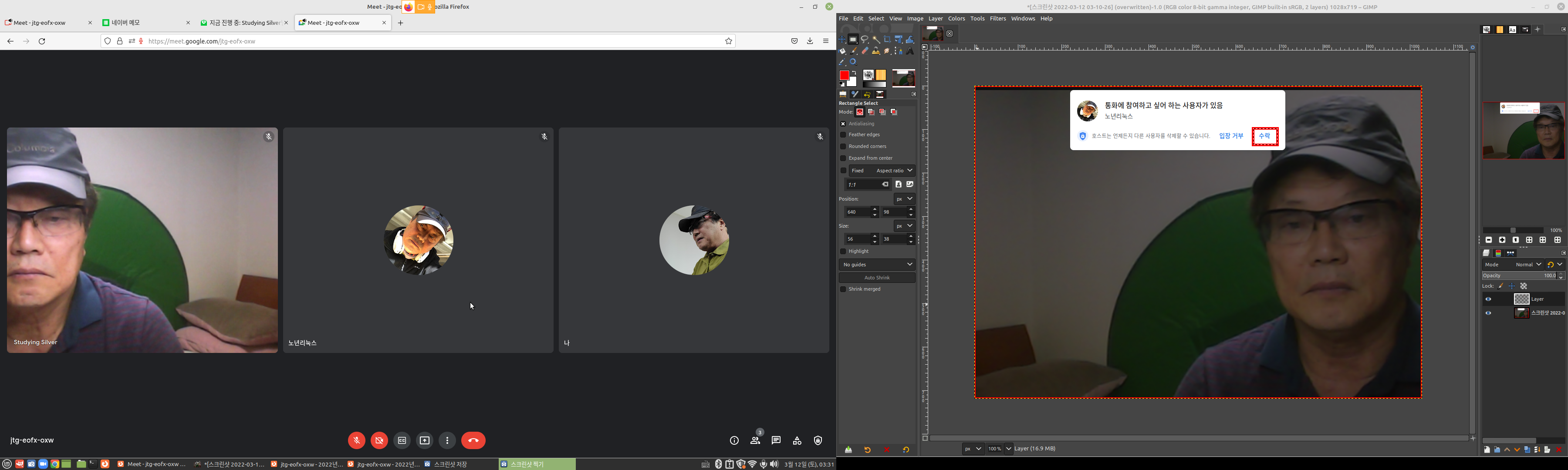 듀얼 모니터를 사용하면 회의 진행은 더욱 편리합니다. 아래 화면은 이 글을 작성하기 위해 오른쪽 모니터에 그래픽 프로그램 '김프'를 띄어놓고 구글미트를 테스트하고 있습니다. 저 혼자 이것저것 참여하면서.