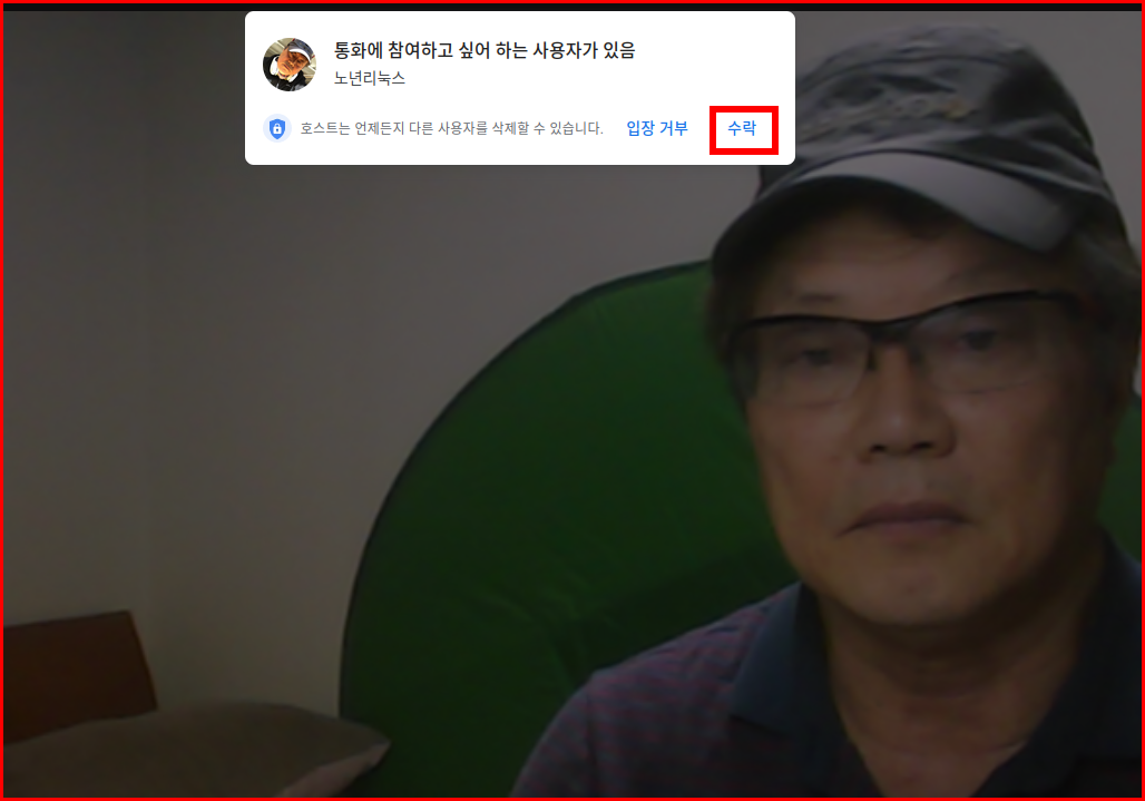 다른 사람이 화상회의 시스템에 참여하는 경우는 호스트가 아래와 같은 메시지 창에 '수락' 버튼을 눌러서 추가 참여를 허용하면 됩니다.