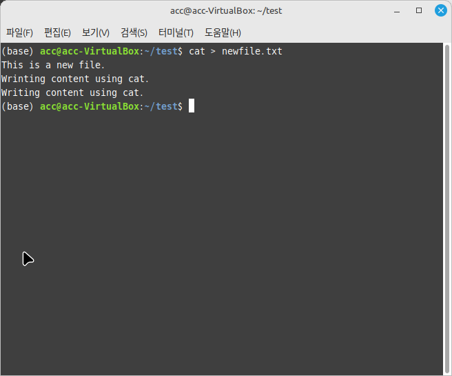 cat명령어에 인자를 지정하지 않으면 표준 입력(stdin)을 대기하며, 사용자가 입력한 내용을 즉시 출력합니다.- 입력 종료는