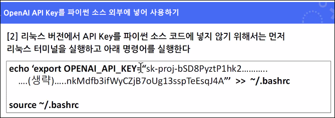 리눅스에서 OpenAI API Key 관리OpenAI API Key를 파이썬 소스 코드 외부에서 관리하기 위한 방법입니다. 주요 내용은 API Key를 .bashrc 파일에 저장하고 환경 변수로 설정한 뒤 이를 파이썬 코드에서 불러오는 방식입니다.요약 설명📌 목적API Key를 파이썬 소스 코드에 직접 쓰지 않고, 리눅스 환경 변수(environment variable) 로 관리하여 보안을 높이기 위함.🧾 명령어 설명echo ‘export OPENAI_API_KEY="sk-프로젝트키"’ >> ~/.bashrcecho: 문자열을 출력합니다.export OPENAI_API_KEY="...": 환경 변수 OPENAI_API_KEY에 API Key를 설정합니다.>> ~/.bashrc: 위 내용을 사용자의 ...
