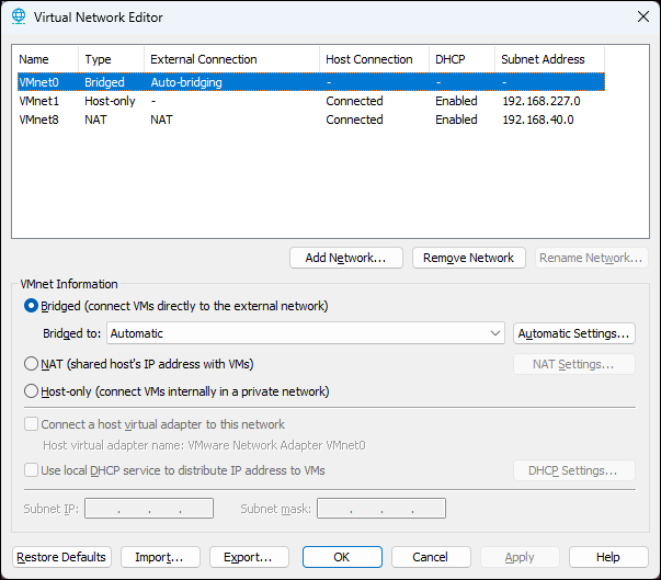 NAT 포트 포워딩 설정VMware NAT 네트워크의 포트를 열어호스트에서 접근할 수 있게 만드는 방법입니다.(1) VMware NAT 설정 열기VMware Workstation 상단 메뉴 → Edit → Virtual Network Editor네트워크 목록에서 VMnet8 (NAT) 선택Change Settings 클릭 (관리자 권한 필요)아래쪽 NAT Settings… 버튼 클릭 (2) 포트 포워딩 추가“NAT Settings” 창에서 Add… 클릭다음 정보를 입력합니다: Host port: 3306 Type: TCP Virtual Machine IP address: 192.168.40.128 Virtual Machine port: 3306 OK → OK로 저장 이렇게 하면호스트의 127.0.0.1:..